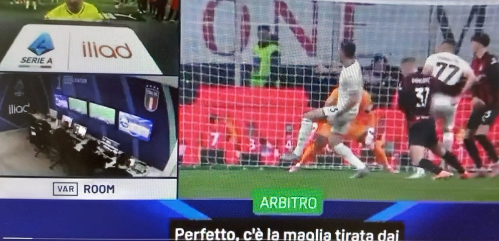 L’arbitro, guarda le immagini, poco convinto, e poi riflette, come se volesse trovare una via di fuga, per un rigore che non lo convinceva (distanza ravvicinata e giocatore del Milan girato di spalle), dice: